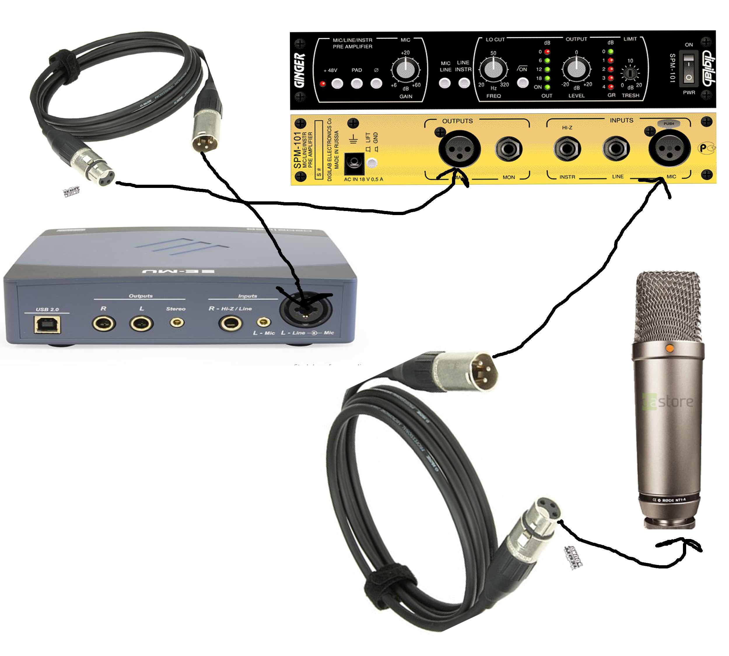 Соединение интерфейса E-MU 0202 USB и конденсаторного микрофона