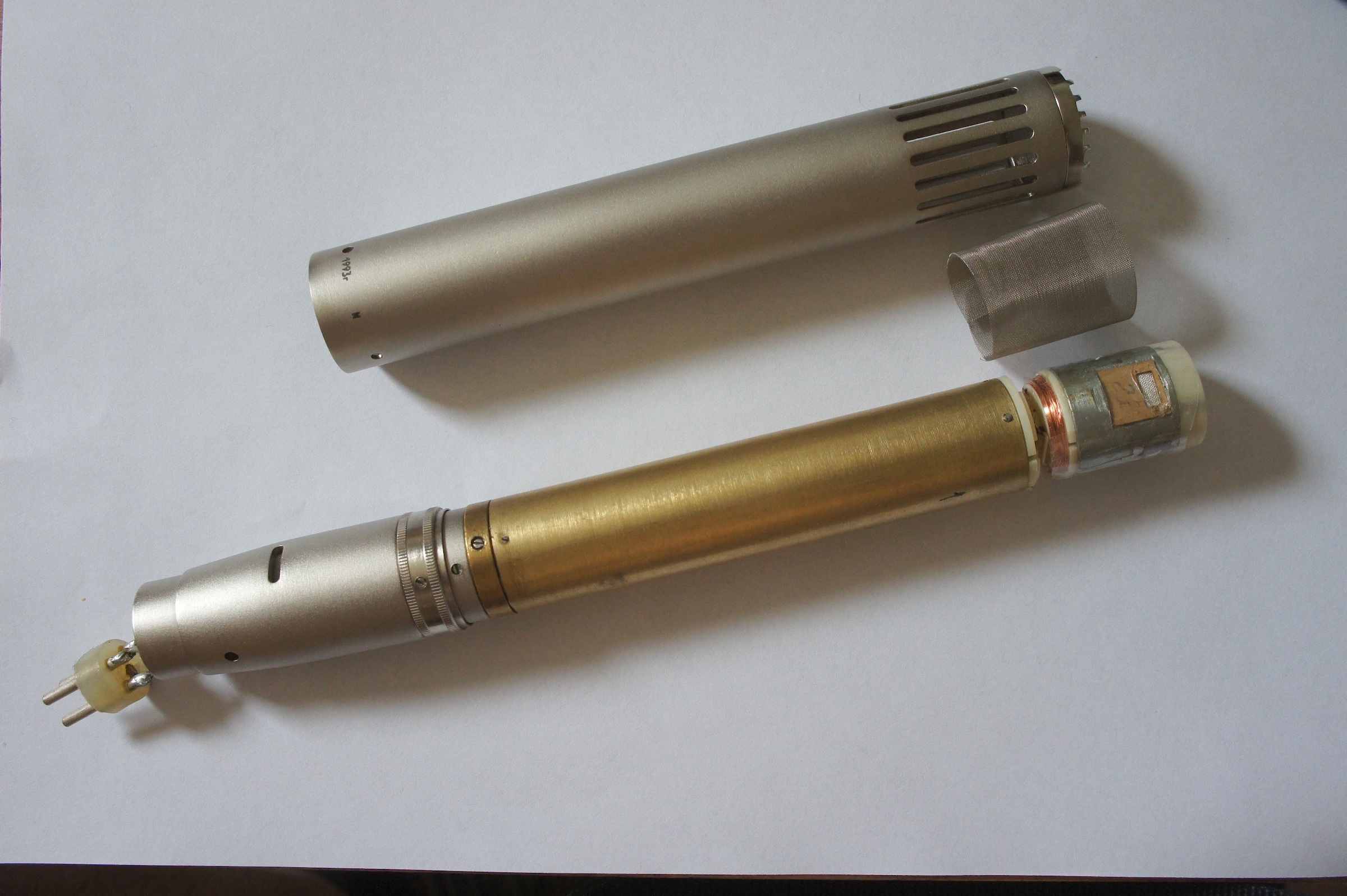 Теперь очень-очень аккуратно снимаем ВЧ-капсюль. Сперва отпаиваем монтажные провода от выводов капсюля (в моем микрофоне они были скручены, так что получилось не за 5 секунд). Потом закручиваем крепёжные винты (у меня один был сорван) и снимаем капсюль. Прямо под ним прячется второй НЧ-капсюль.